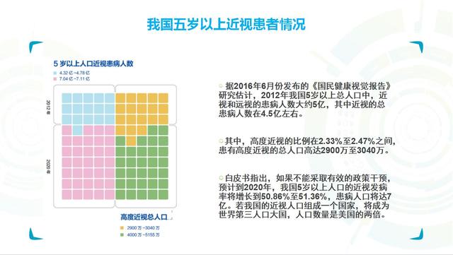 這個白皮書還告訴我們,如果不能夠及時采取有效的干預(yù)措施,到2020年的時候,我們國家5歲以上的人口近視發(fā)病率將進(jìn)一步增長到51%或者還要多一點(diǎn)。那么這個人口就不再是5億了,就接近7個億。這個數(shù)字很嚇人,是美國現(xiàn)有人口的兩倍。
