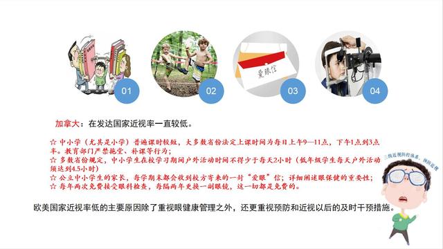 我們可以看到加拿大的近視率一直維持很低,中小學(xué),尤其是小學(xué)課堂時間短,更多的時間讓孩子到戶外去,給孩子真正的童年。教育部門嚴(yán)禁拖堂,不允許拖堂時間,也不允許補(bǔ)課。在加拿大省份里都強(qiáng)調(diào)每天戶外活動時間不能少于兩小時。所以這三個國家都一致的強(qiáng)調(diào)每天增加戶外活動。
