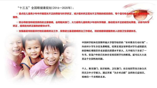 全國十三五健康規(guī)劃,其中包括眼健康規(guī)劃,在眼健康規(guī)劃的十幾條當(dāng)中涉及到兒童有9條,這里提出來三條是我們應(yīng)該關(guān)注的。