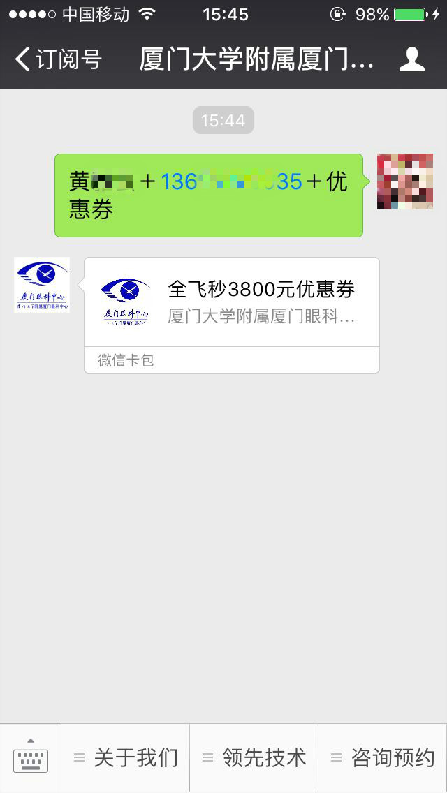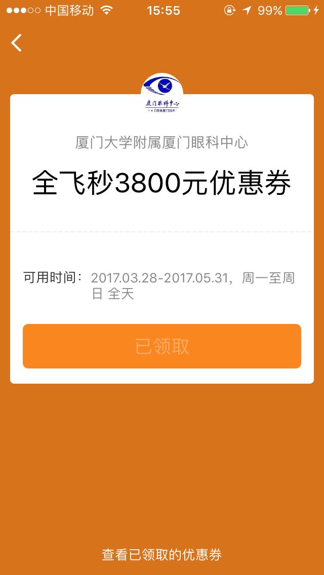 1、點(diǎn)開廈門眼科中心微信公眾號(hào) → 點(diǎn)擊“全飛秒3800元優(yōu)惠券”微信卡包 → 點(diǎn)擊最下面“查看已領(lǐng)取的優(yōu)惠券” → 全飛秒3800元優(yōu)惠券