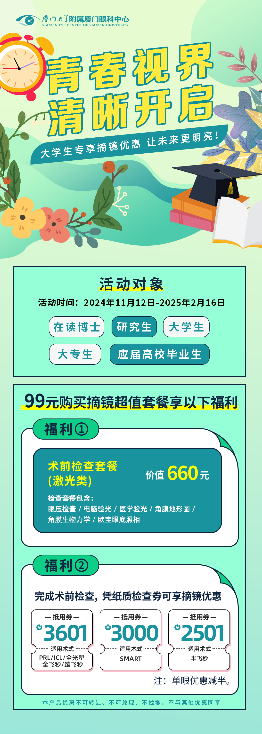 近幾年,大學生做近視手術已屢見不鮮,在走進大學校園時或剛剛畢業(yè)準備就業(yè)時選擇做近視手術仿佛已經成為一種“風尚”。那么身為“大學生”群體中的一員,做近視手術會不會有優(yōu)惠呢?近期不少福建大學生都在后臺留言。一起來看看吧!