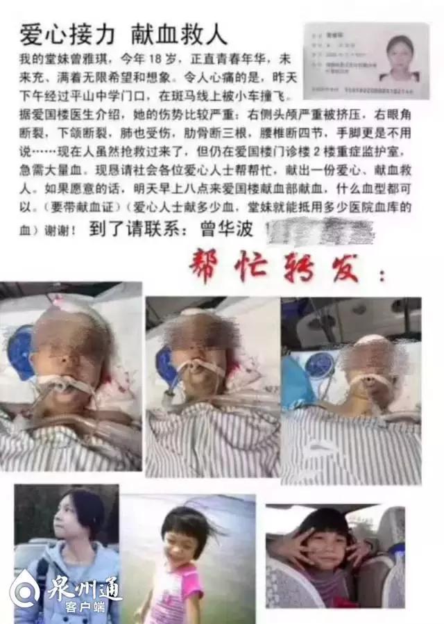 雅琪手術(shù)后第二天,一場(chǎng)關(guān)于她的愛心接力在朋友圈傳開了,一條“愛心接力獻(xiàn)血救人——晉江少女曾雅琪不幸遭遇車禍”的求助信息被眾人轉(zhuǎn)發(fā)。