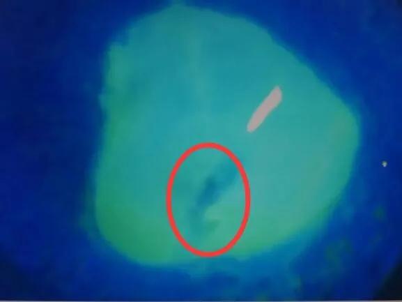 老楊右眼術(shù)前熒光造影照片—紅色圓圈中黑色區(qū)域為角膜穿孔的部分