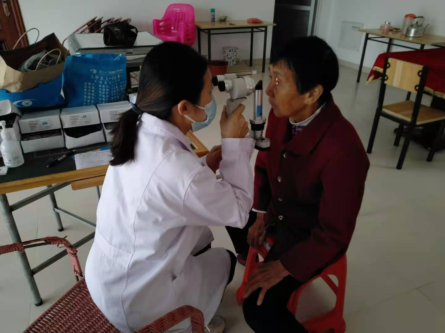 剛從田里回來的李奶奶,一大早就搬著小板凳,等著醫(yī)生做檢查。