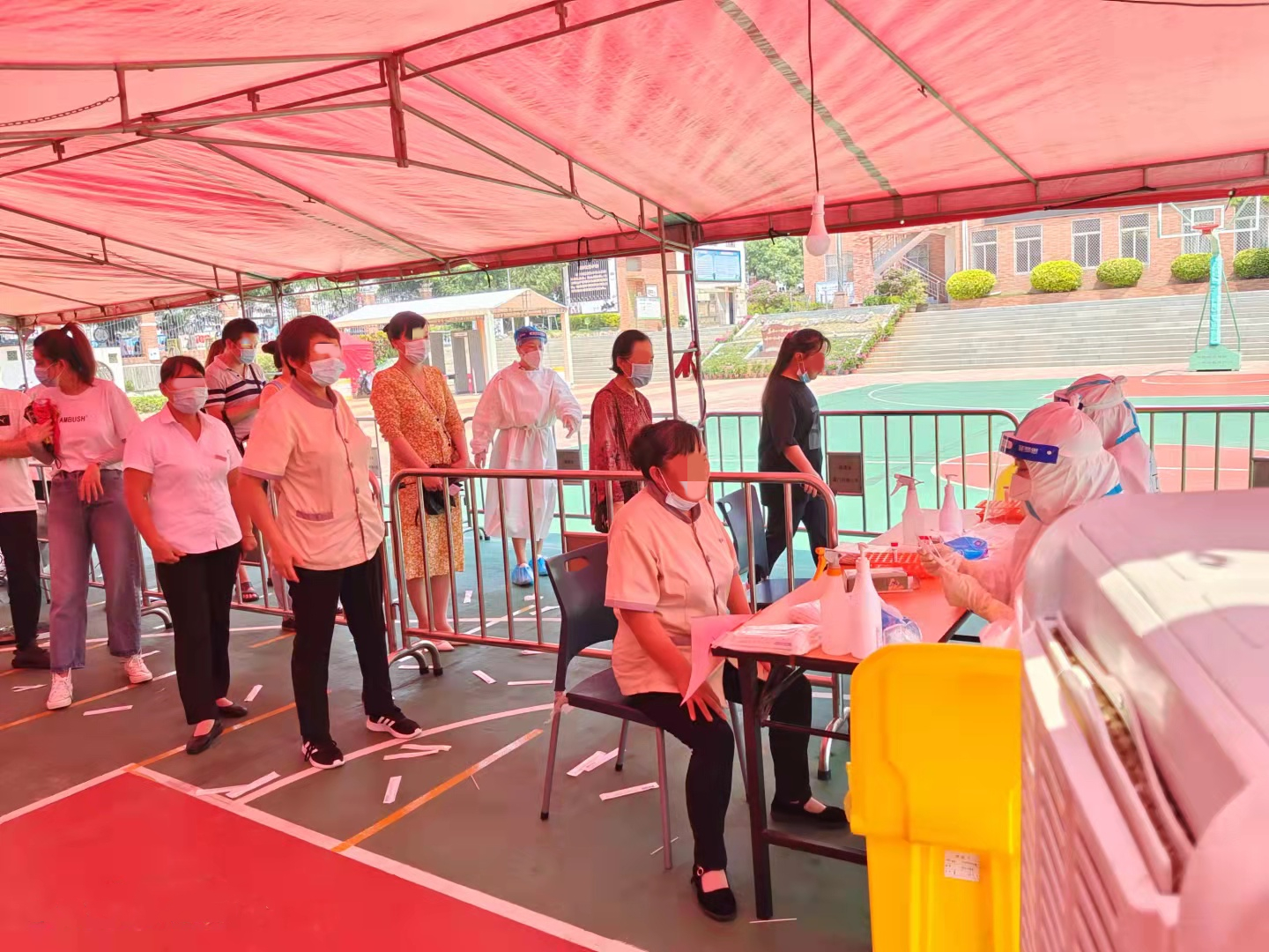 在采樣點,醫(yī)護(hù)人員穿戴著又厚又熱的防護(hù)用品,正在有條不紊地進(jìn)行著緊張的采樣工作。“沖鋒在前,吃苦在前。”在高溫的炙烤下,在緊裹的防護(hù)服中,他們沒有絲毫退卻,任汗水濕透衣襟,任雙手雙腳泡得發(fā)白,耐心細(xì)致地為每一位市民做好采集工作。他們用意志錘煉初心,用行動書寫決心,全力以赴堅決守護(hù)家園,為早日打贏疫情防控殲滅戰(zhàn)作出應(yīng)有的貢獻(xiàn)!