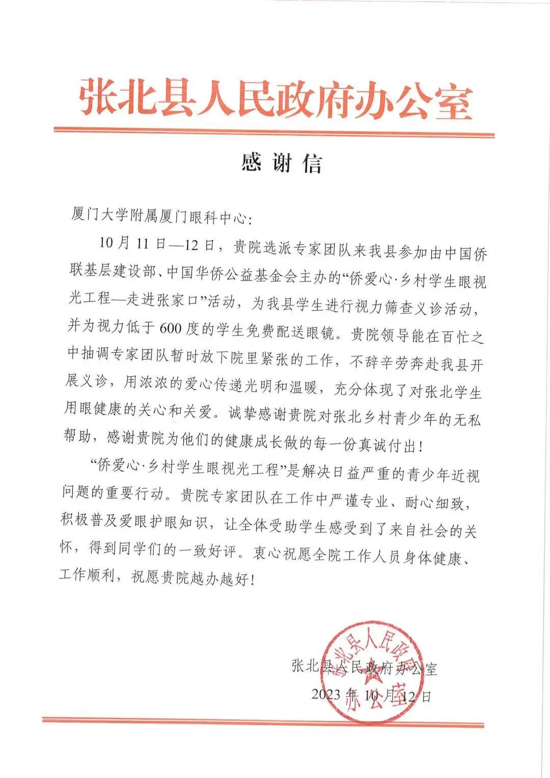 【文章導(dǎo)讀】近日,廈門(mén)眼科中心接連收到來(lái)自中國(guó)僑聯(lián)基層建設(shè)部、懷安縣和張北縣人民政府辦公室的三封感謝信,信中對(duì)廈門(mén)眼科中心在僑愛(ài)心鄉(xiāng)村學(xué)生眼視光工程-走進(jìn)河北張家口公益活動(dòng)中的