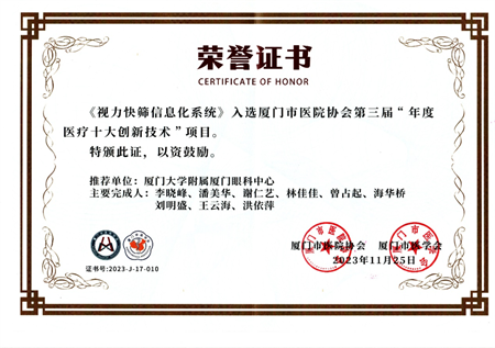11月25日,在廈門(mén)市醫(yī)院協(xié)會(huì)第三屆年會(huì)暨“學(xué)科引領(lǐng)高質(zhì)量發(fā)展”學(xué)術(shù)會(huì)議上,廈門(mén)大學(xué)附屬?gòu)B門(mén)眼科中心“視力快篩信息化系統(tǒng)”榮獲廈門(mén)市醫(yī)院協(xié)會(huì)第三屆“年度醫(yī)療十大創(chuàng)新技術(shù)”項(xiàng)目,同時(shí)“視力快篩信息化技術(shù)推廣項(xiàng)目”經(jīng)國(guó)家衛(wèi)生健康技術(shù)應(yīng)用推廣項(xiàng)目專(zhuān)家論證會(huì)論證,成功入選中國(guó)民族衛(wèi)生協(xié)會(huì)2023年度“衛(wèi)生健康技術(shù)重點(diǎn)推廣項(xiàng)目”。