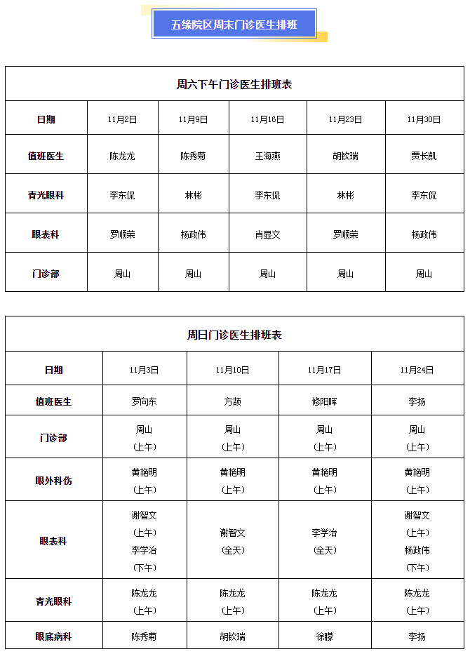 11月周末專家門診排班表如下